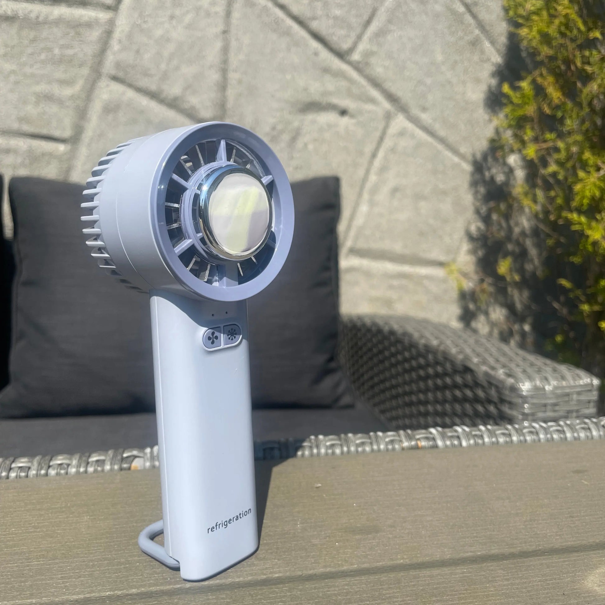 Den håndholdte og stående viften kommer i en fin hvit og lyseblå farge, som vil passe inn i ethvert interiør. Med et slankt og kompakt design, tar den minimalt med plass og kan enkelt tas med på reiser.